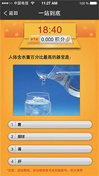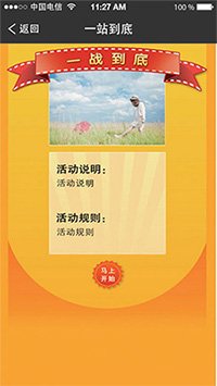 一战到底活动是以电视节目《一站到底》为灵感所开发的一款益智答题类的微信营销应用。支持商家自定义题目,商家可以把跟自身相关的商业信息作为题目,让微信粉丝参与答题的同时可以强化商家的营销信息和品牌概念。活动期间,每个用户每天只能参与一次答题,答对加分,答错不扣分,活动结束后根据得分情况排名(同样积分者,答题速度优先的用户排名为先)派发奖品。